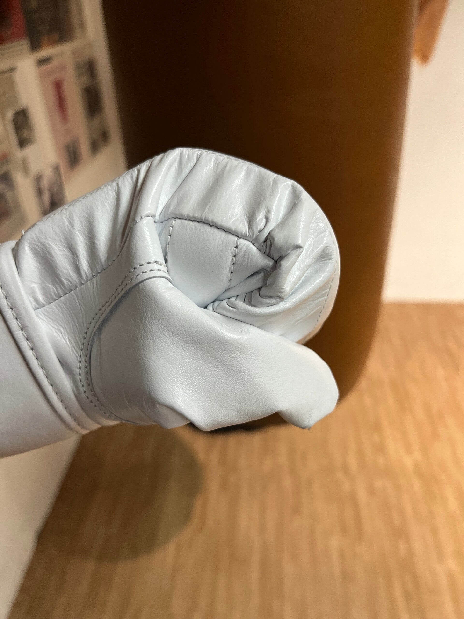 Doe je windsels om zoals gewend, maak een vuist en meet van je eerste naar je laatste knokkel. Ik draag maat S en m'n knokkels met windsels waren 8,5cm. De grip bij de vingertoppen past zich razendsnel aan, al na 2 à 3 trainingen kan je een echte vuist maken.